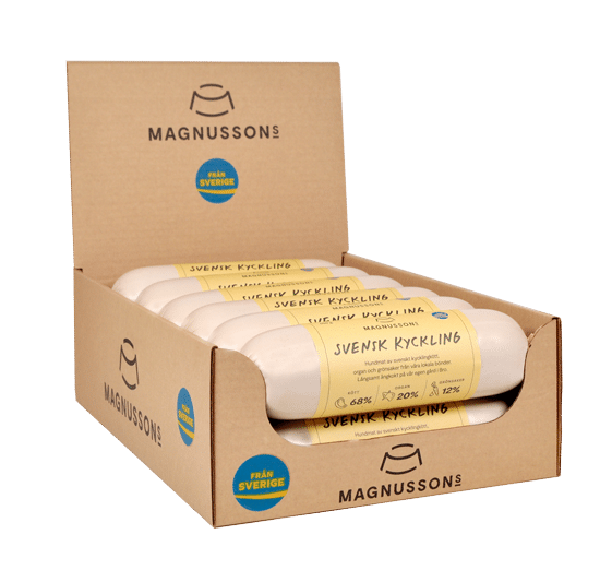 Magnussons Svensk Kyckling är ett smakrikt komplett våtfoder för hundar bestående endast utav animaliska råvaror av Ekologisk Kyckling. Magnussons Ångkokta våtfoder är lagat på svenskt kött, organ och grönsaker från lokala bönder. Tack vare att produkten långsamt ångkokas kan den lagras i rumstemperatur i upp till 12 månader.